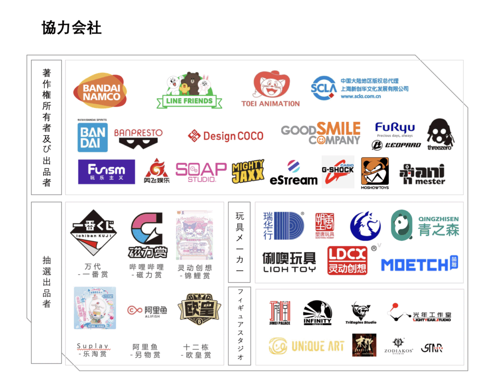 主要なライセンサー及び版権元と協力し、抽選景品や玩具を提供。二次元キャラクター商品の正規供給チェーンを構築しています。これにより、ファン層の 拡大と二次元市場の成長を実現します 。